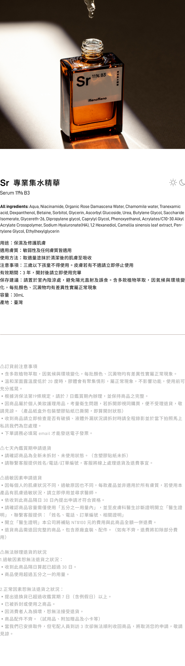 ▪︎ 含 11% 高濃度菸鹼醯胺 B3 與維他命 B5,極致保濕精華