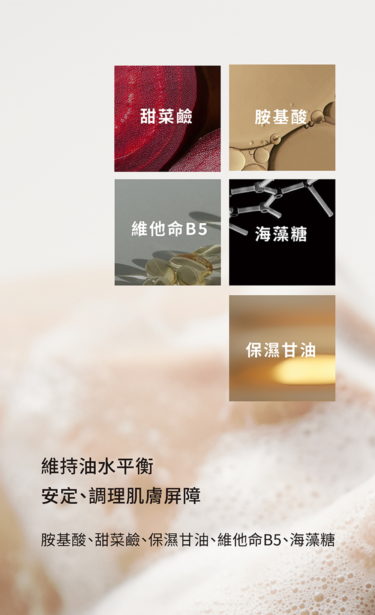 • 胺基酸第四代複合配方,維持肌膚油水平衡