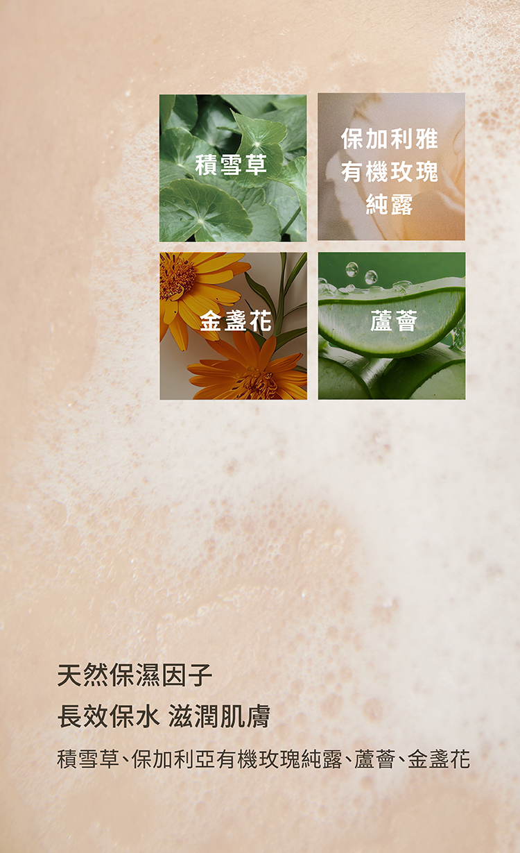• 添加維他命B5、積雪草、 甜菜鹼、海藻糖保濕修護分子