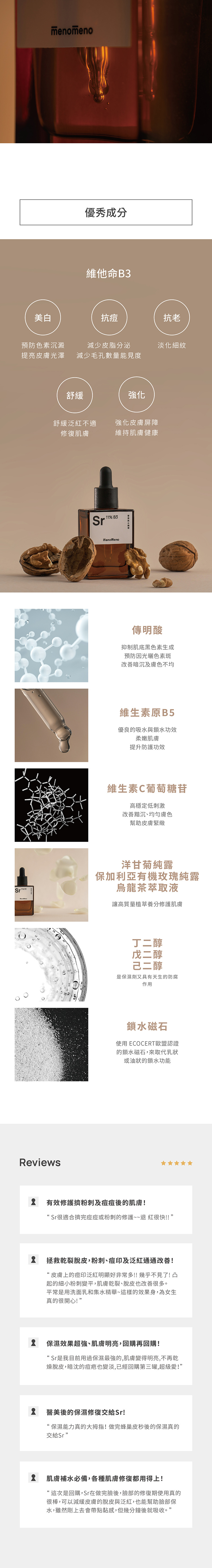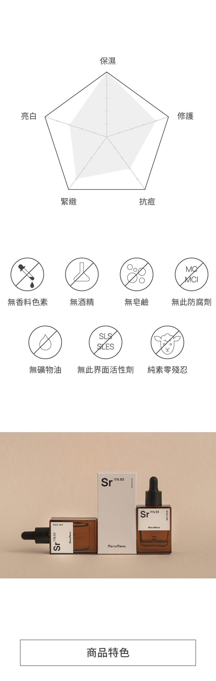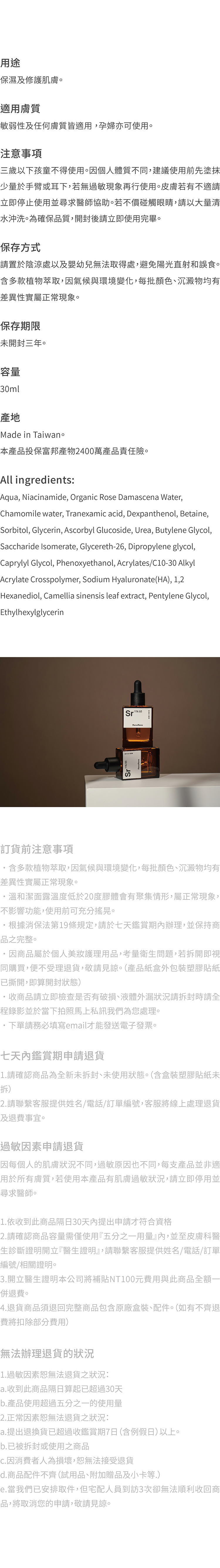 保濕鎖水、亮白均勻、舒緩修護及抗老。